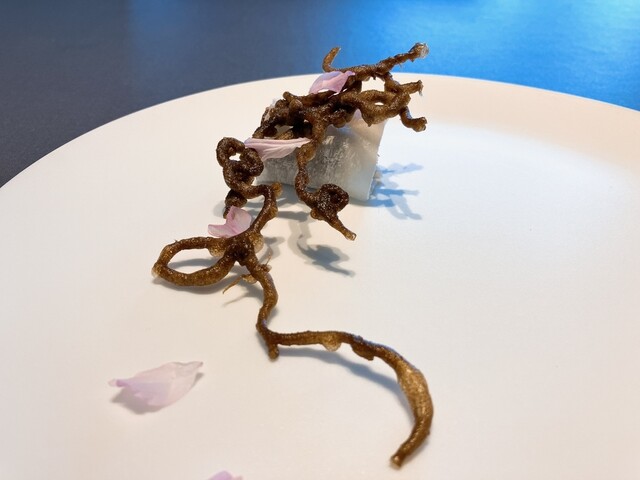 大根を桂剥きのように薄くスライスし、ミルフィーユ状にしてバターでカリカリにしたソテー。