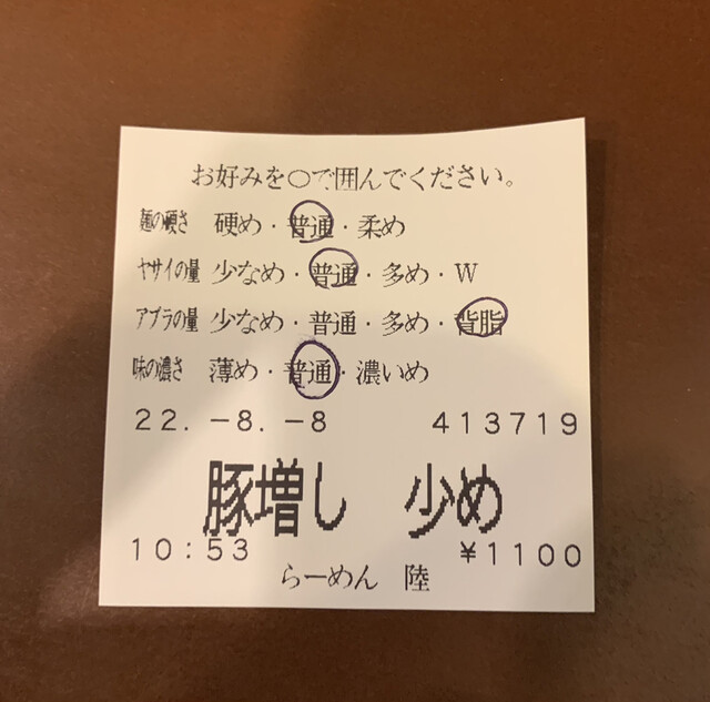 以前より券のサイズが大きくなったように思いましたがわたしはそのままカウンターの上に置きます。周りのヤサイ増しとかコールのある方は各自ペンをとって券に書き込んでました。