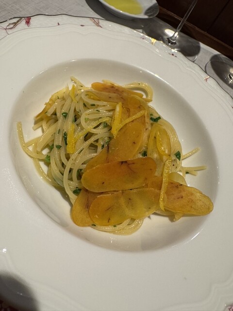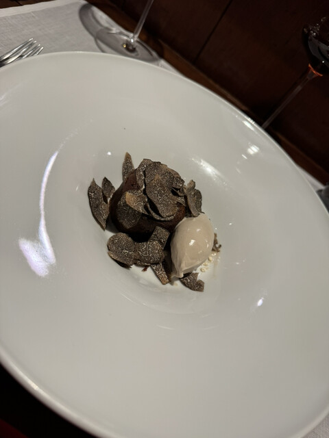 この時期だけの白トリュフコースを頂きました。香り高い白トリュフに合う料理とワインを頂けます。ワインにも少し入れて頂くのは初めてでした。