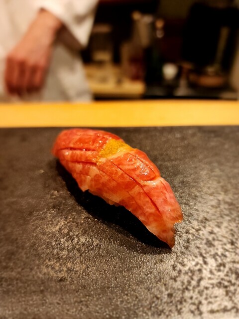 凛々しい赤身、鉄の旨味をたっぷりと含み力強い香りを漂わせる。トロとの緩急を愉しむ。