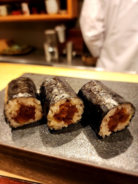 春子、瑞々しく旨味が溢れる。シャリの酸味が甘味をキリッと引き締める。季節の移り変わりを感じる一貫。シャリも調整され、季節の種を活かしておられます。