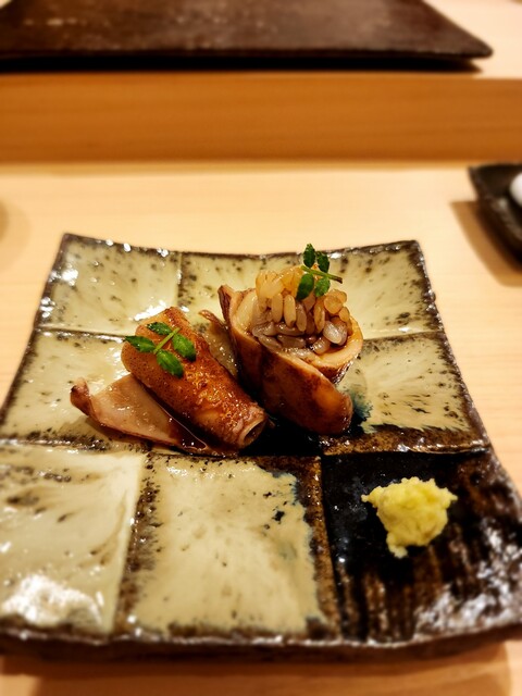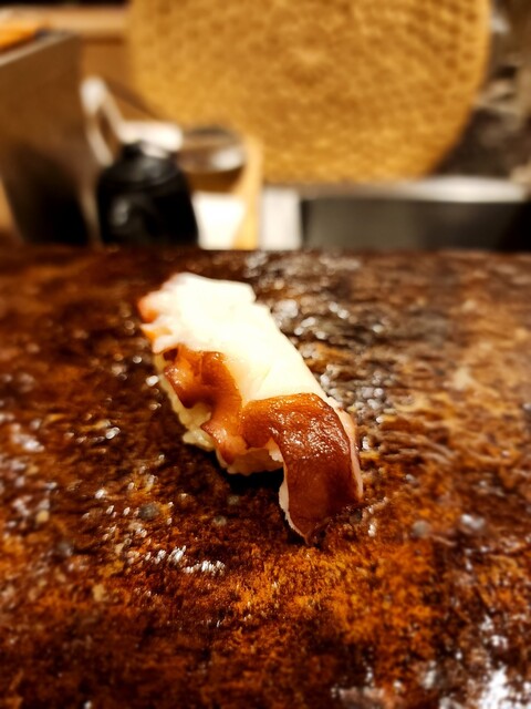 子持ち槍烏賊、産卵前の貴重な時期しかいただけない、仕事も千差万別。卵はとろとろでもっちりと旨味が絡む。シャリの酸味が甘味を引き締め味わいが非常に魅力的だ。