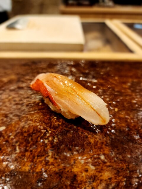 鯛の昆布締め、シャリに甘味が寄り添う。シャリのコクが深く塩気が凛々しい。