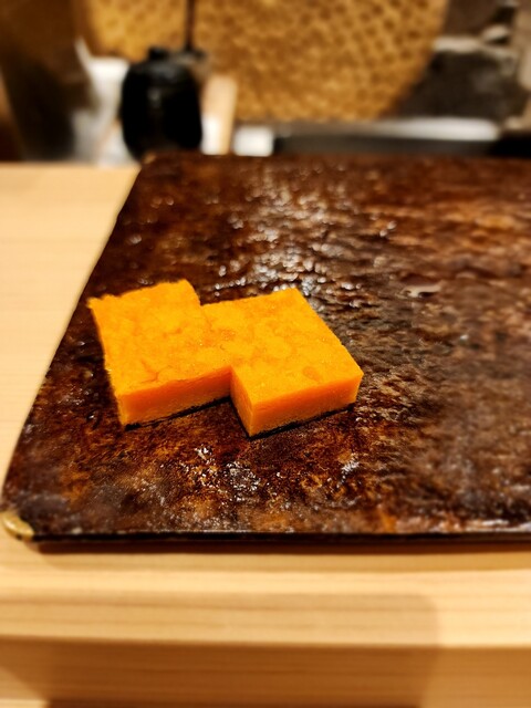 蛸、好きな種の一つ。身質は、柔らかく繊維が解れていき、香りを纏った甘味が高まってくる。塩で高まる濃厚な旨味。