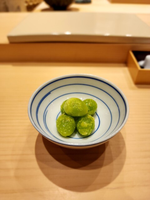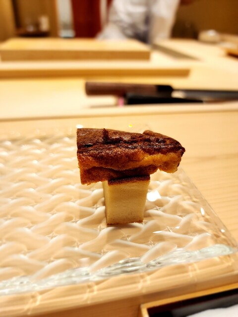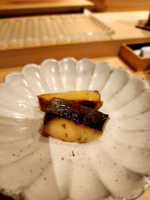 鱚、黄身朧に漬けられ柔らかな甘味が華やかに漂う。味わい深い一貫。