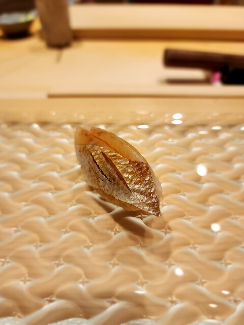 珍しい一貫、白星笛鯛。滑らかな脂が魅力でとろっと甘味を滲ませる。