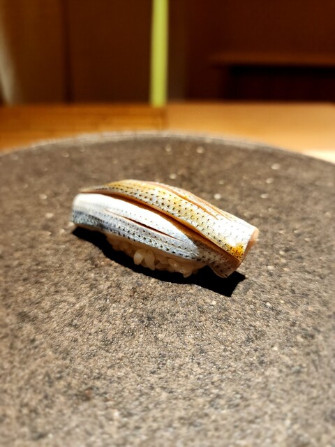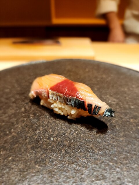 小鰭、きりっと酸味が旨味を引き締める。噛むと朧の甘味が調和し、旨味を高める。鮪の後に広がる清々しい余韻。