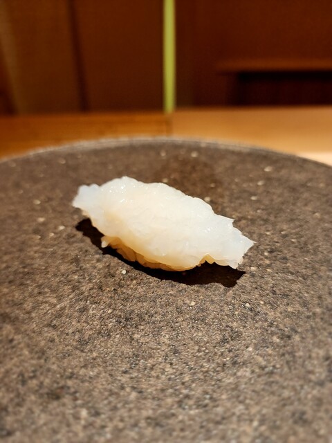 剣先烏賊、庖丁でねっとりと甘味を表現される。食感に張りも残し、咀嚼を強め甘い香りが漂う。
