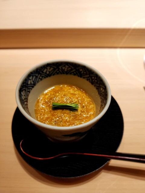 藻屑蟹の茶碗蒸し、蟹の旨味が濃縮される。底にはシャリが敷かれ途中から雑炊の様に味わいが変化する。