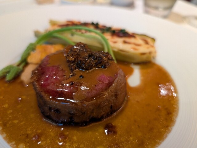 もう間違いないですね、ギュチッと嚙み締められる牛フィレは脂の重みなく、巻かれた豚肉によって閉じ込められた肉汁が噛むたびにじゅっわじゅわとあふれ出る。