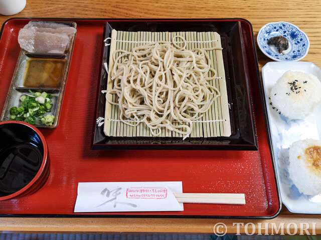 ワタシと嫁さん、小2末娘の3人が十割ざるそば(880円・税込)、小5娘は十割かまあげそば(880円・同)を注文。あと、わさび味噌と野菜ふりかけのおむすびが載った焼き結びセット(220円・税込)を2セットつけてもらった。