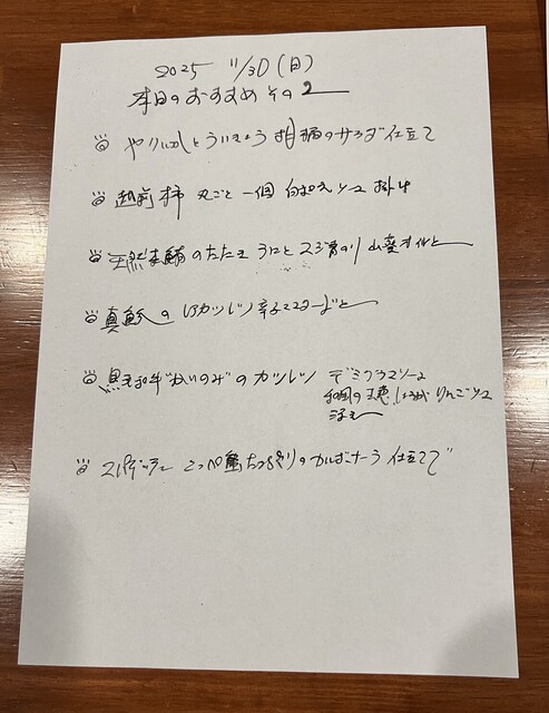 通常はメニューにない「ビフカツ」と、「こっぺ蟹(セコ蟹)」のお料理を予約時にお願いしましたところ、快く応えてくださました。