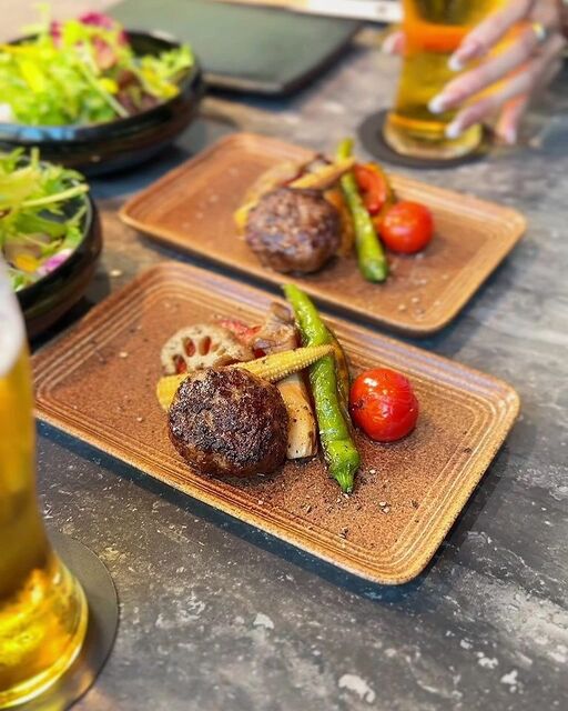 ここのコースは肉汁あふれるハンバーグから始まります。箸を入れるとじゅわっと肉汁が広がります。