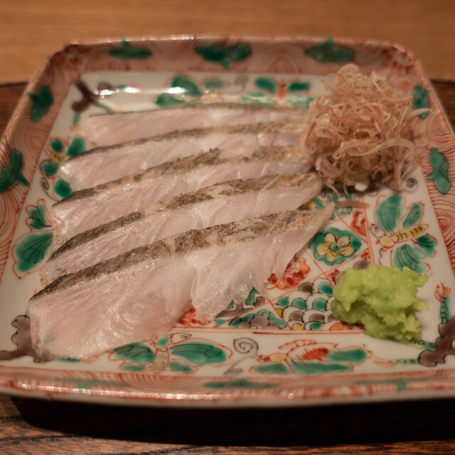 ・鱧にズイキ 「炭おとし」炭に直接近づけて表面のみ火を入れる。燻製とは違うスモーキーさ、食べたことのない味。