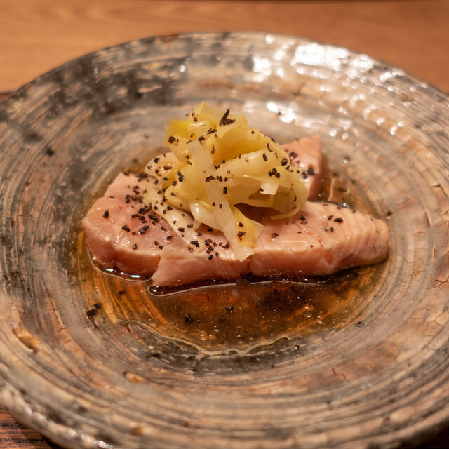 ・桜鱒炙り 喜韮 塩昆布 出汁酢 胡麻油