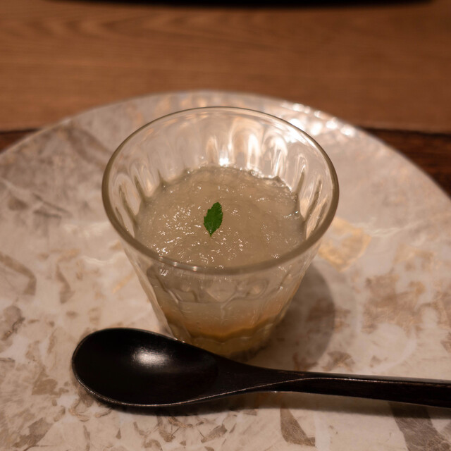 ・デザート メロンのスープ ラム酒のアイス 黒糖のゼリーよせ 揚げ湯葉