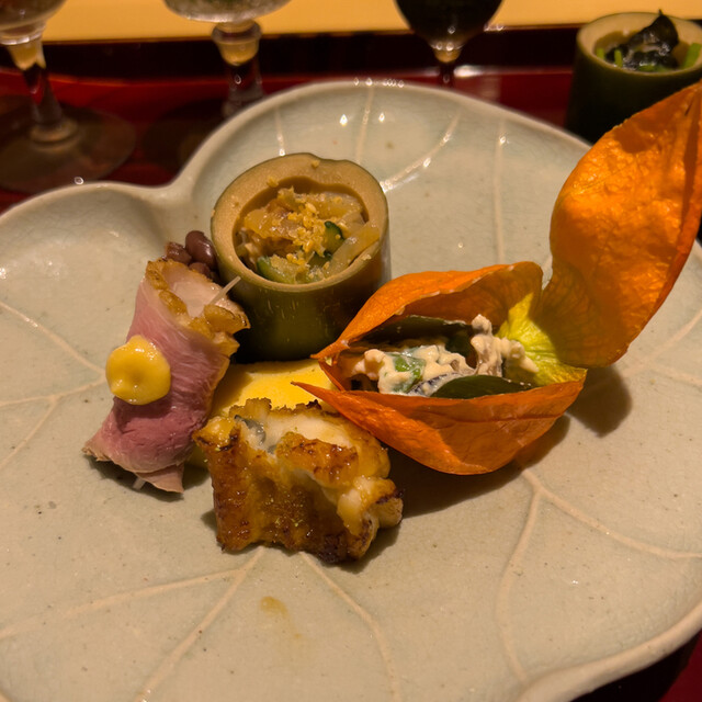 ・八寸 卵しんじょう、チーズの漬け、飯蛸、こごみ、スモークサーモンを蓮根で巻いたもの、菜の花の昆布締め、タイコ、鴨ロース、筍とイカの木の芽和え、金柑の茶巾絞り、ウスイエンドウを甘く炊いたもの