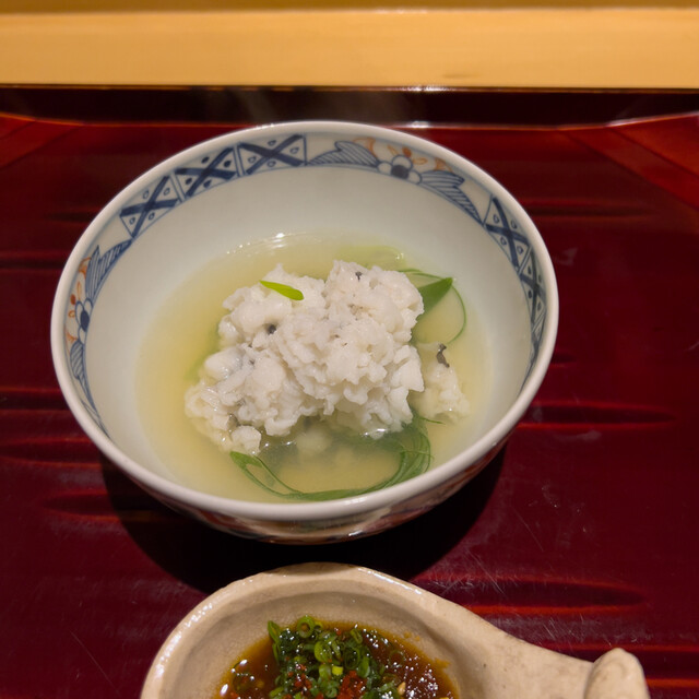 カウンター11席にBGMはない。ますは香煎茶から。貝を使ったしつらえの先付。大阪では季節風の「貝寄風(かいよせ)」が吹くと春が来たと感じられる。聖徳太子を祀る精霊会で貝寄席で打ち寄せられた貝を使う。