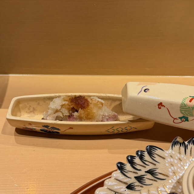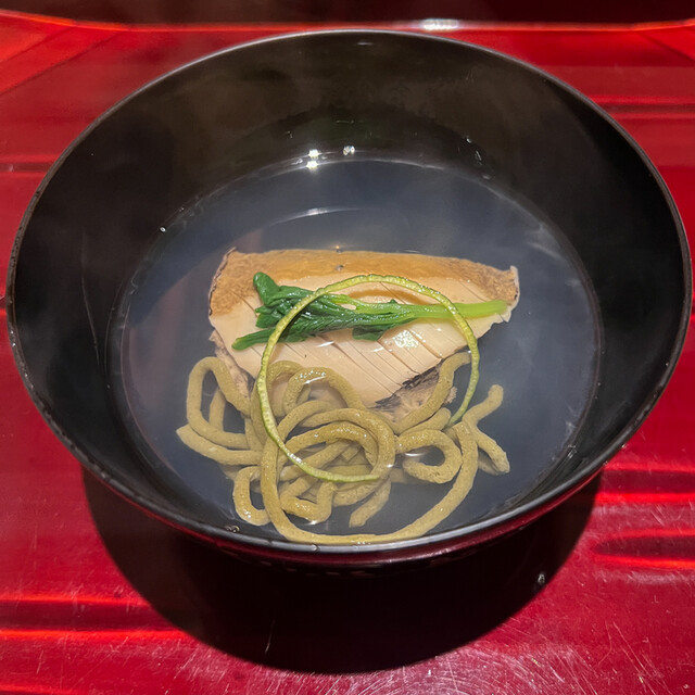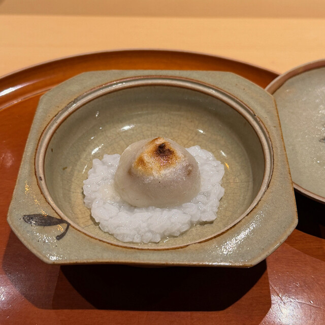・平貝の磯部焼きとカラスミ 以前はフォアグラ最中が出ていた手順 これが新スタンダードになるのか?