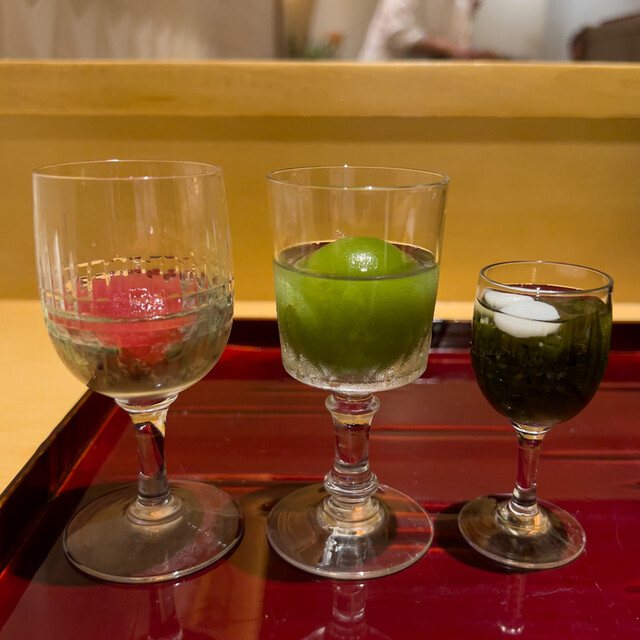・八寸その三 グラスはすべて110年前のバカラ トマトとジュンサイ 青梅を甘酸っぱく炊いたもの ワカメと白玉 竹の筒には桑名の蛤と三つ葉のお浸し 皿には 胡瓜とクラゲと鰻を使った酢の物 タコと小豆を炊いた蛸の小倉煮 穴子の山椒焼き 卵を蒸しあげた卵しんじょう ホオズキの中にはどんこ椎茸と三度豆(インゲン)の胡麻白和え