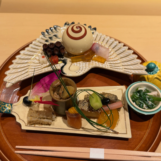 ・八寸 餅花の飾り 鶴の向付 羽子板の向付 松葉 竹の猪口 梅人参・梅長芋・のし梅 松竹梅のしつらえ 鯛の昆布締め 数の子 鶏皮ゴボウの土佐煮 クワイの松風焼き スモークサーモン キジとセリのお浸し 蛸 ナマコなど ブリたたき いぶりがっこ