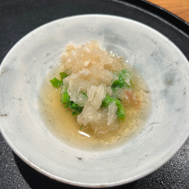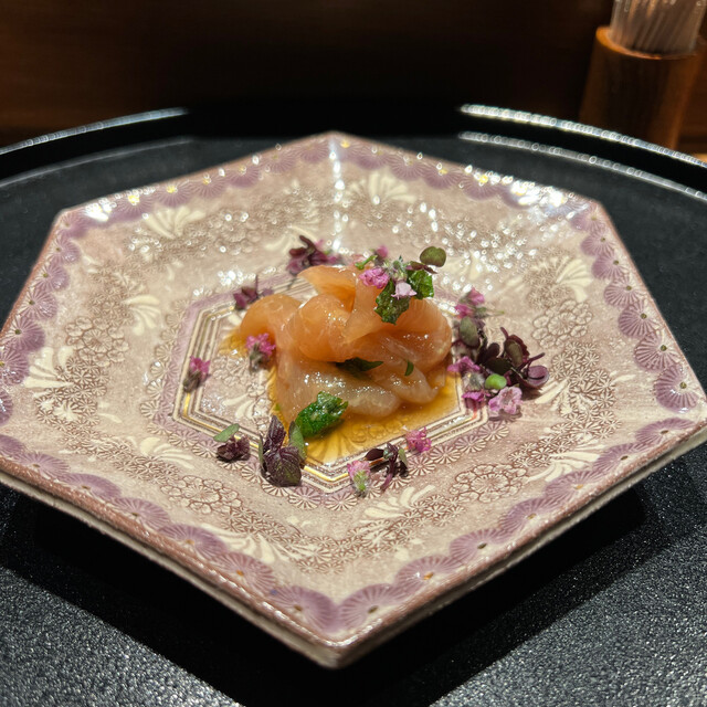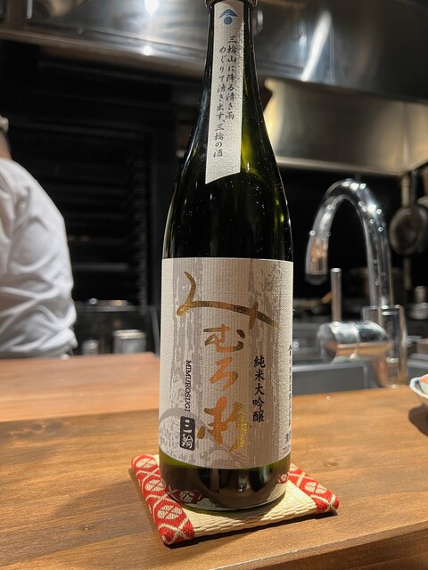 南北線麻布十番駅が近いが、川を越えて住所は三田になる。赤羽橋駅からも8分ほど。ひとけのない路地の奥にひっそりと看板あり。カウンター七席。BGMはない。酒はシャンパーニュから日本酒3種。亀泉、石鎚、みむろ杉純米大吟醸。