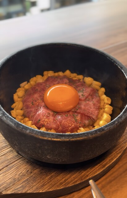 〆の和牛とトウモロコシの石焼ガーリックライスは熱々の石鍋でジュージュー混ぜられたガーリックライスは香ばしくて、コーンの甘みも相まってたまらない味!お腹いっぱいなのに美味しすぎて即完食。
