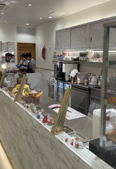 オープンキッチンスタイルになっていて、注文してからクリームやフルーツを丁寧にトッピングしていく工程がすべて見られるのが楽しい。見ているだけで甘い香りに包まれて幸せな気分になります。