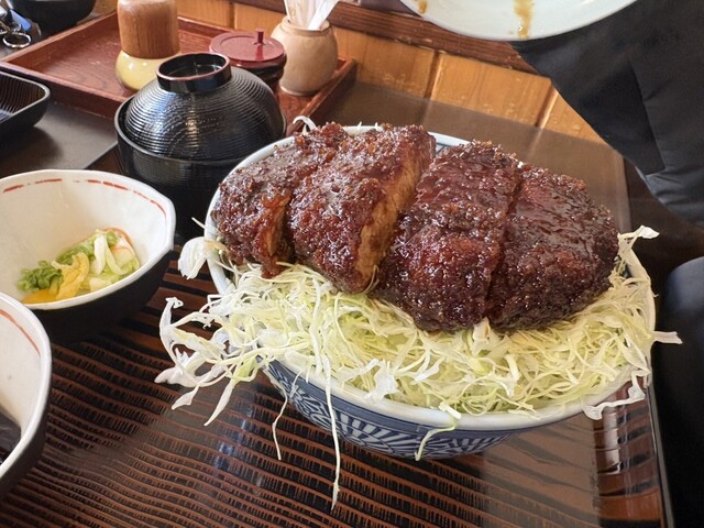 グループでエビフライ定食とソースカツ丼を注文しました。蓋からはみ出る豪快なトンカツとフルーティーなソースでご飯もキャベツも進みます!駐車場も余裕あります。地元民に教えてもらったので、テレビで紹介されたお店よりも穴場で良かったです。