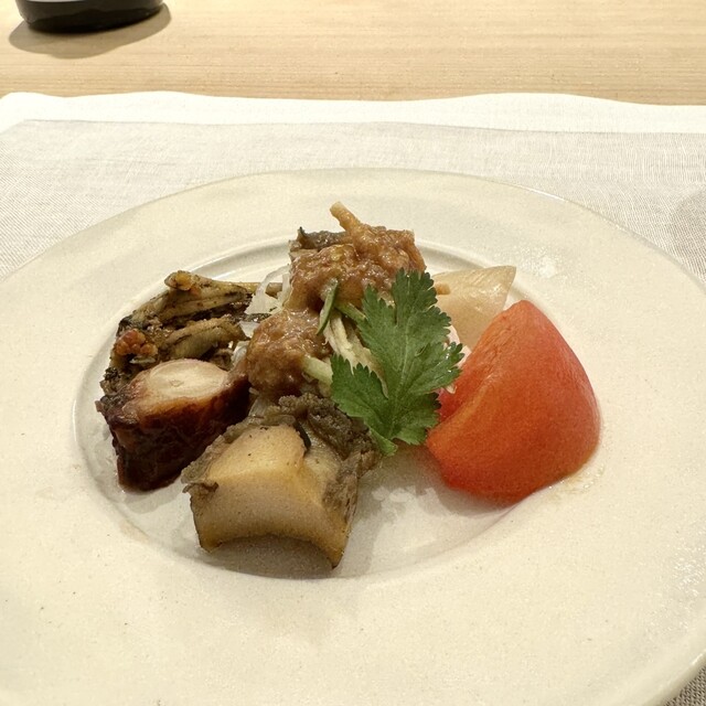 冷製盛り合わせ:たこ烏龍茶漬、四川風ローストビーフ、とこぶし紹興酒漬、湯葉の巻物