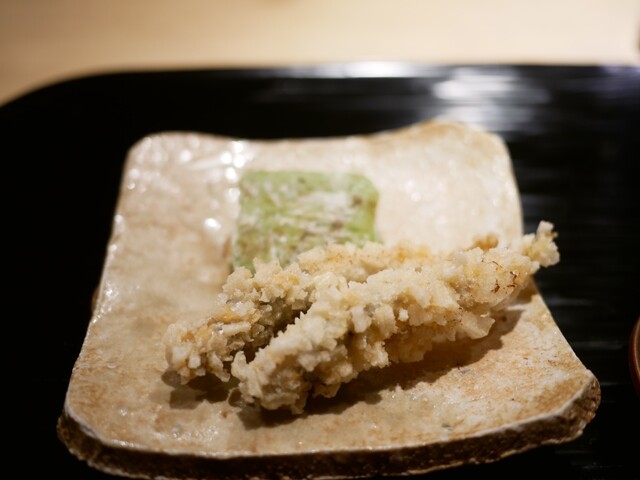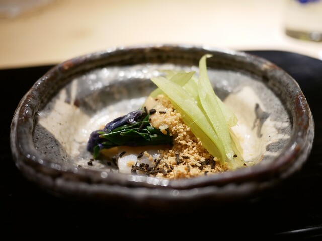 八寸 平貝このわたとろろかけ、おとはく菊菜、コッペ蟹、 玉子カステラ、海老芋の素揚げ、蓮根チップ