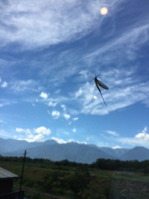 メニューを頼んでからは、窓の外にくっついていたウスバカゲロウの写真を撮ったり