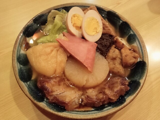 ジーマーミ豆腐の天ぷら、ラフテーの味噌煮、沖縄おでん、紅芋の天ぷら。