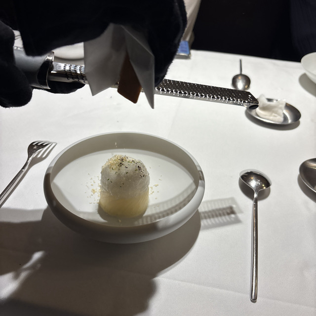 バターでポーチした蝦夷鮑 生ハムのブイヨン(8500円)スープが鮑とすっぽんと生ハムらしい。生ハムの分塩分が強めだが、スープが美味しい