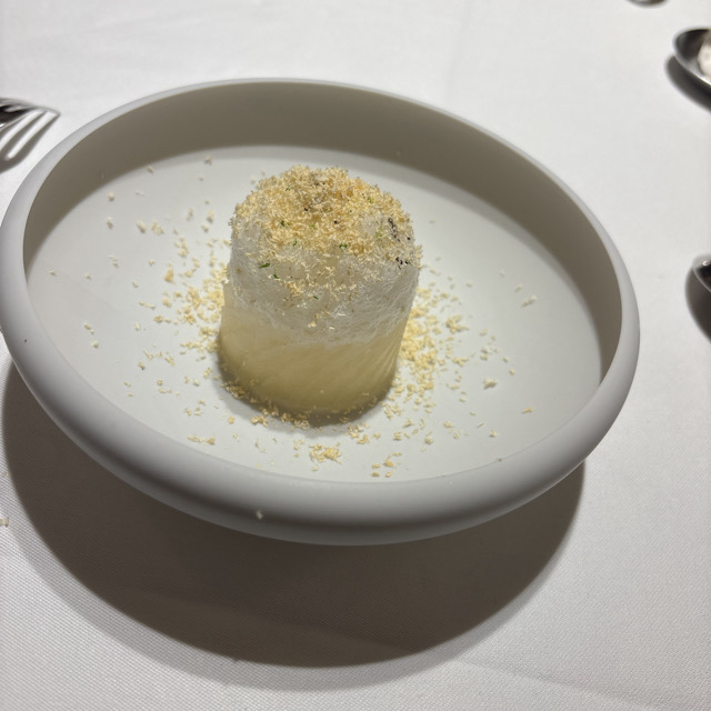 いつものようにオリーブとナッツのアミューズで始まり、続いて我々の二つ目のアミューズは、新玉葱のブルーテ ミント風味のプティ(これが旨い)、娘には二つ目のアミューズとして、鯛とアスパラガスのタルタル キャビアのせ(これも美味しいが、娘は我々の新玉葱のブルーテの方が気に入っていた)。娘は、パルメジャーノレッジャーノのつまみに、トウモロコシのスープ(これがとてつもなく美味しかったらしい)とチーズのリゾット。