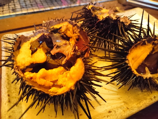 焼きあがったホタテの貝殻を使いまして、蛸の吸盤を焼いたりします。 そしてホンワカと焼きあがった雲丹は生とはちょっと違う味わいがあります。