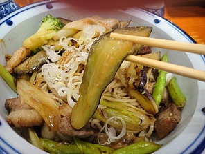 さて、カレーせいろには、野菜、ポーク、チキンとありますが、主としてブログの写真写りを理由にワシにしては珍しく野菜せいろを選択いたします。 蕎麦出汁とうまく組み合わされたほどよい感じにスパイスが利いたつけスープには、玉ねぎ&長ねぎ、ニンジン、パプリカ、揚げナス、ブロッコリー、プチトマト、長いも、カボチャと野菜がドッサリ入っております。 トーゼンながらカボチャは我妻に引き受けてもらいますが、その分も含め、パスされるカツ丼や、果てはうどんまで飛んできたのはいつものコトであります。