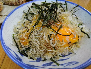 まずは、じゃこめし=釜揚げシラス+卵黄の組み合わせはサッと醤油をかけまわしていただきます。