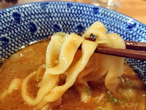 シンプルで追加トッピングなしのつけ汁も見た目と匂いで「◎」というのが分りますし、麺も平麺なのに「縮れ」がしっかり入っているので食感も楽しめそうデス♪