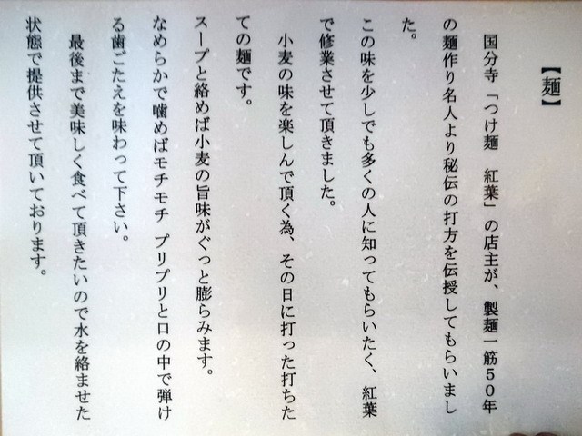 でもって、そのコダワリも紹介しておきましょうね(参) ちなみにスープというかつけ汁は一種類のみのようですが、潔くてヨイと思います。