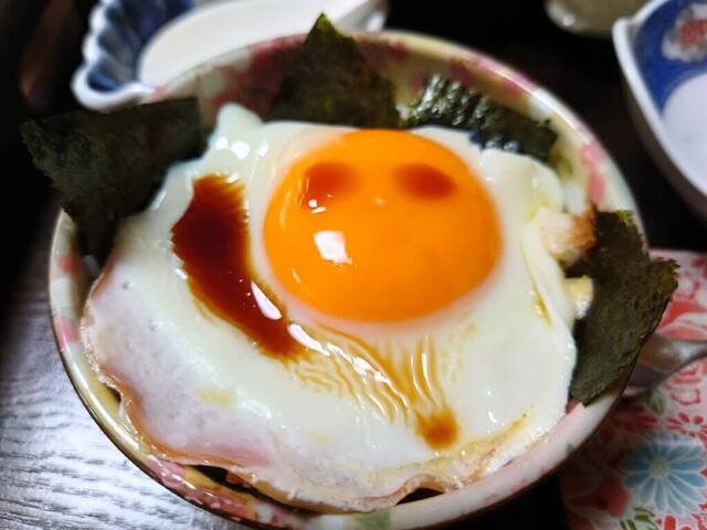 そして、玉子料理は陶板仕立ての目玉焼きは紙焼きにバターが敷かれています。 蒸しまではイキマセンが、白飯に載せてチョイチョイと醤油をかけて仕上げます。