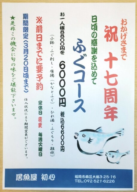 いよいよ河豚の旬のシーズンとなり、例年のキャンペーンが始まった。今年で17周年とのことだが、この時期は事前予約で、ふぐコースが一人税抜6000円で堪能できる。たいへんありがたいプランである。