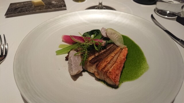小松菜のソースが美しい。イメージ通りの白身魚の味。