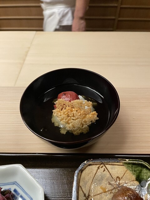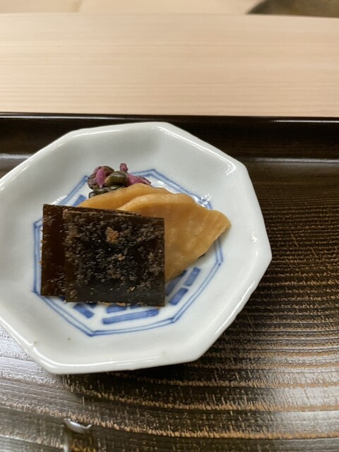 クエ炙りは半生でうますぎ。大徳寺納豆の仄かな塩味と香りが合わさって良き。