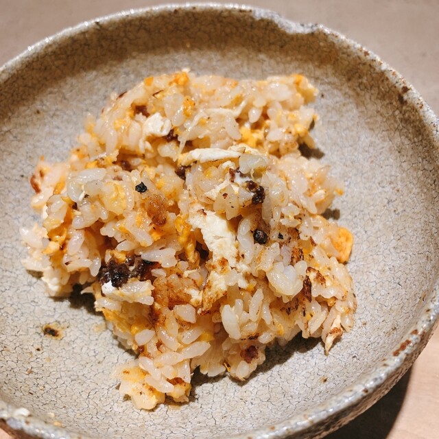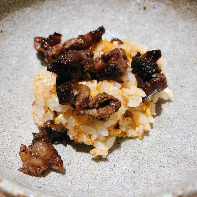 もひとつ書いておきたいのは、〆。まさかの炒飯でまずそれにビックリだけど、先の肉の筋と脂をカリカリに焼いてウスターソースを潜らせて乗っけてある。食材を無駄にしないという心意気と、筋と脂を食べるならこれが一番美味しいですよ、というシェフのこだわりが詰まった逸品。美味かった。