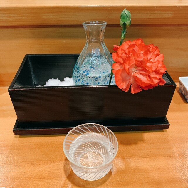 ビールで喉を湿らせていたが、こんなの出てきたら日本酒以外の選択肢はないので、早速北見の地酒《白杜の雫》を所望したら、超すてきな状態で出て来た!氷を張った器に草花の飾り。これでまたお店に惚れちゃうよね。味はスッキリして飲みやすく、旨味も程よく効いていてつまみを選ばないで飲める。
