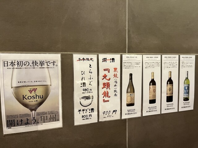 日本酒の種類も豊富でしかもワインの種類(特に国産)もそこそこあるので、旦那が和食、私が洋食とワインが飲みたい時はここで決まりですが、アクセス的に頻繁に伺える場所ではないのが少し残念です。