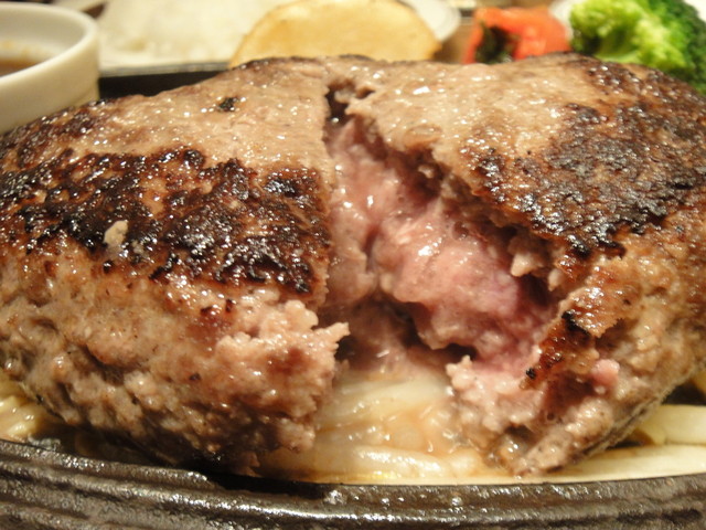 存在感のあるハンバーグは、真ん中がミディアムレアで割れば肉汁が溢れ出ます。
