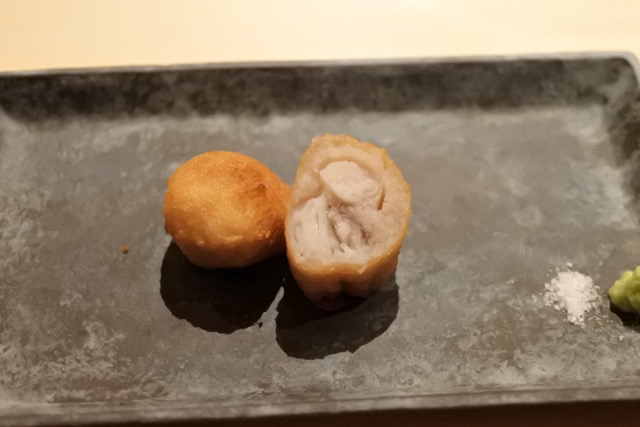 ⚪︎聖護院大根のふろふきに白味噌と黄身の出汁、揚げたての真薯に自家製の赤柚子胡椒
