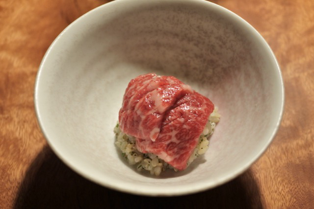 馬肉のバラオビと呼ばれる希少な部位を軽く昆布で締め、玄米は硬めに炊き玄米には生のエゴマを刻んだものや香ばしく焼いたエゴマシードとエゴマのオイルと生姜の甘酢を…。